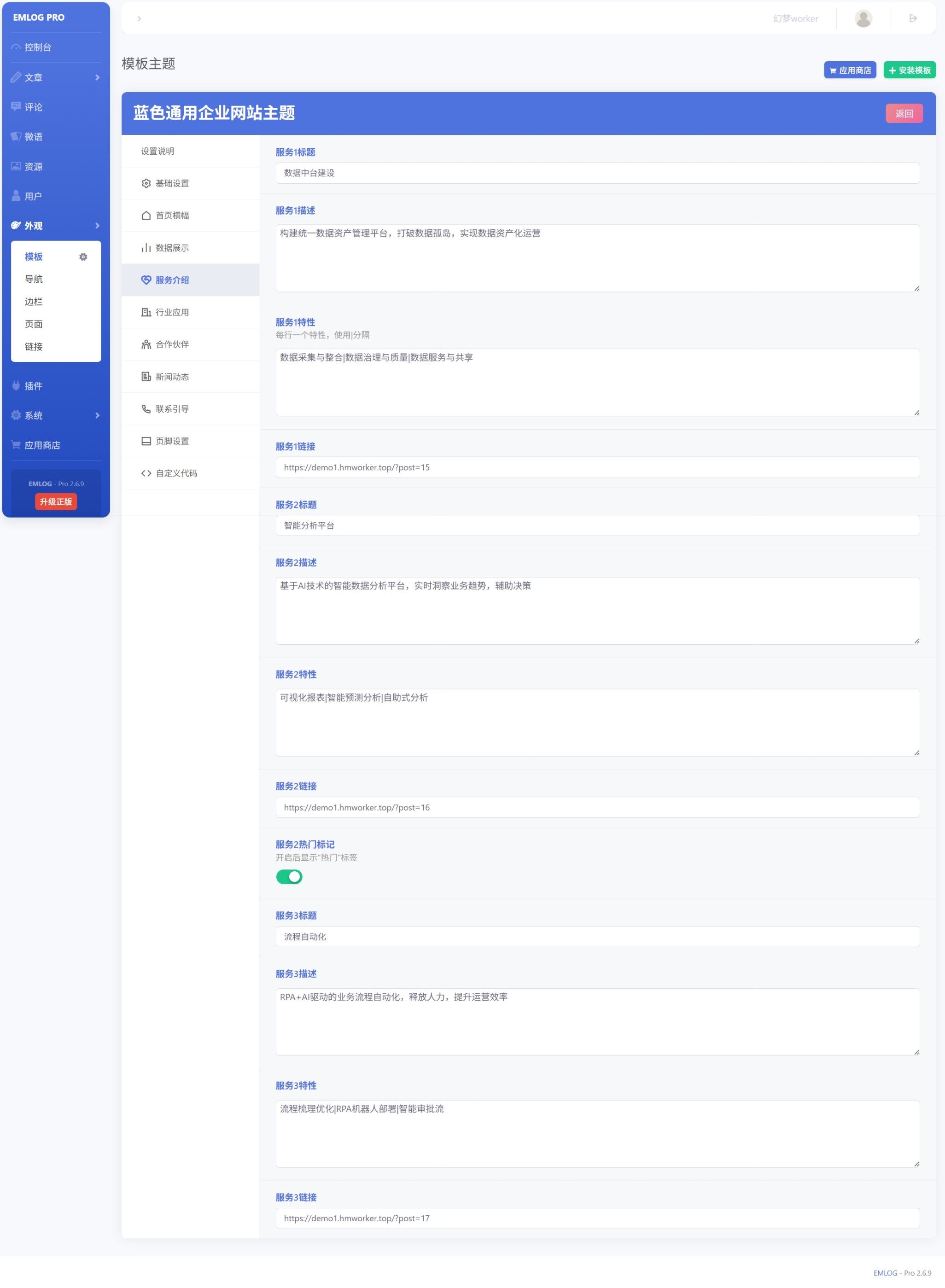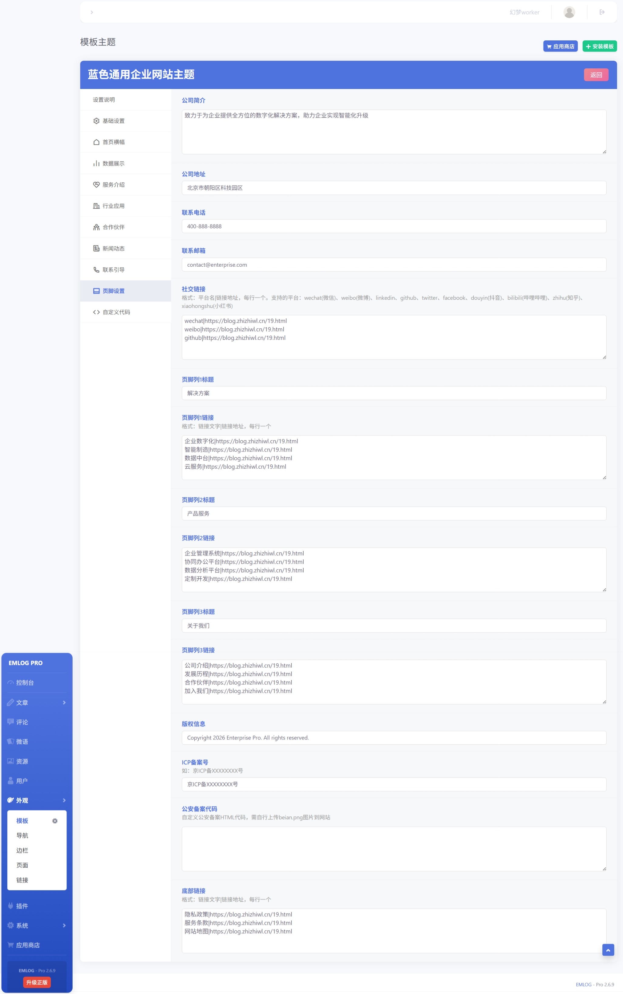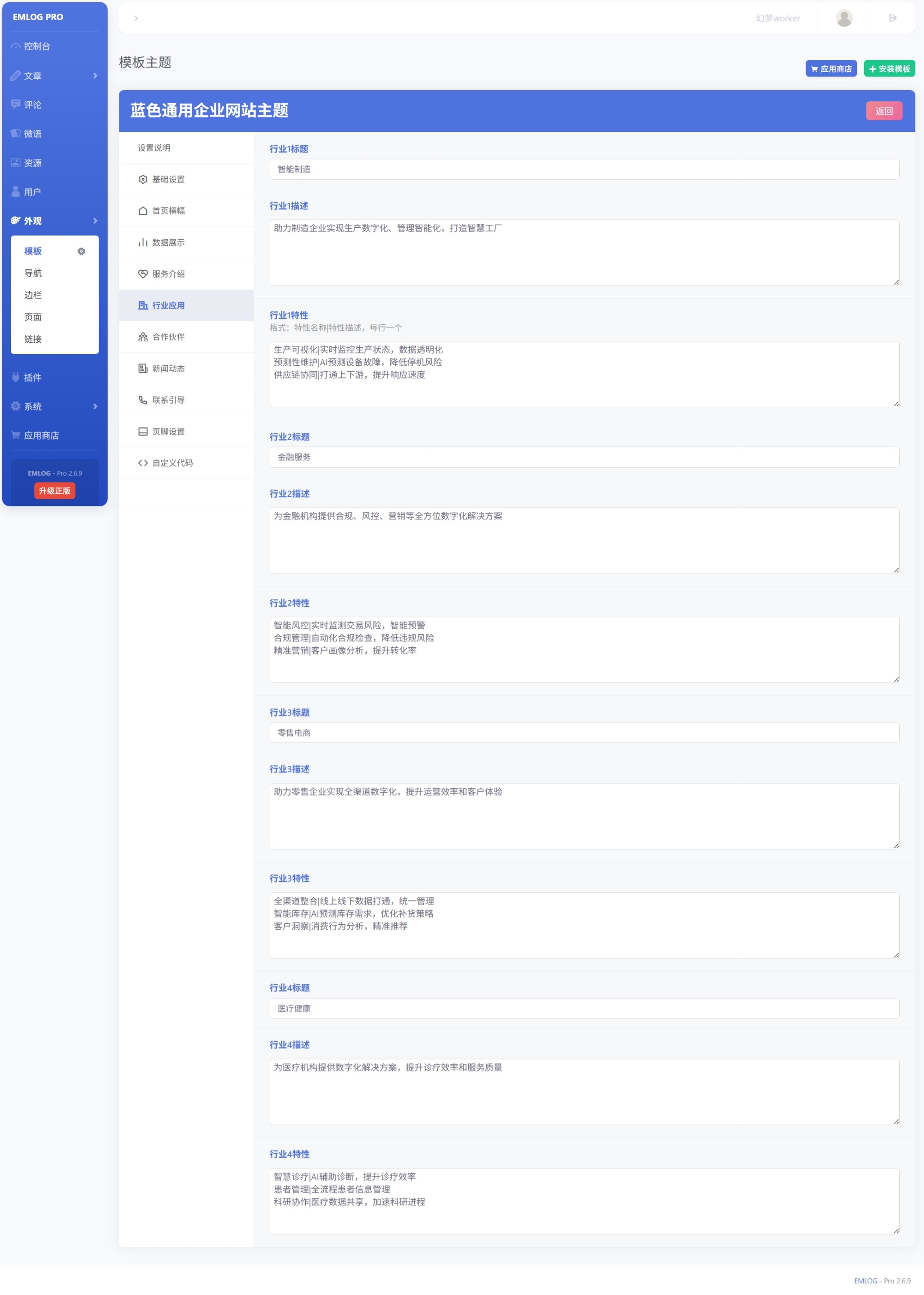 一款专为 Emlog Pro 设计的企业展示主题,采用现代蓝色调设计风格,适合企业官网、公司展示等场景。