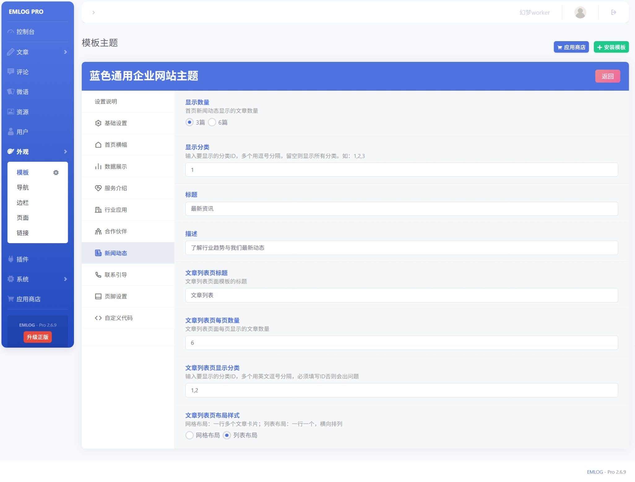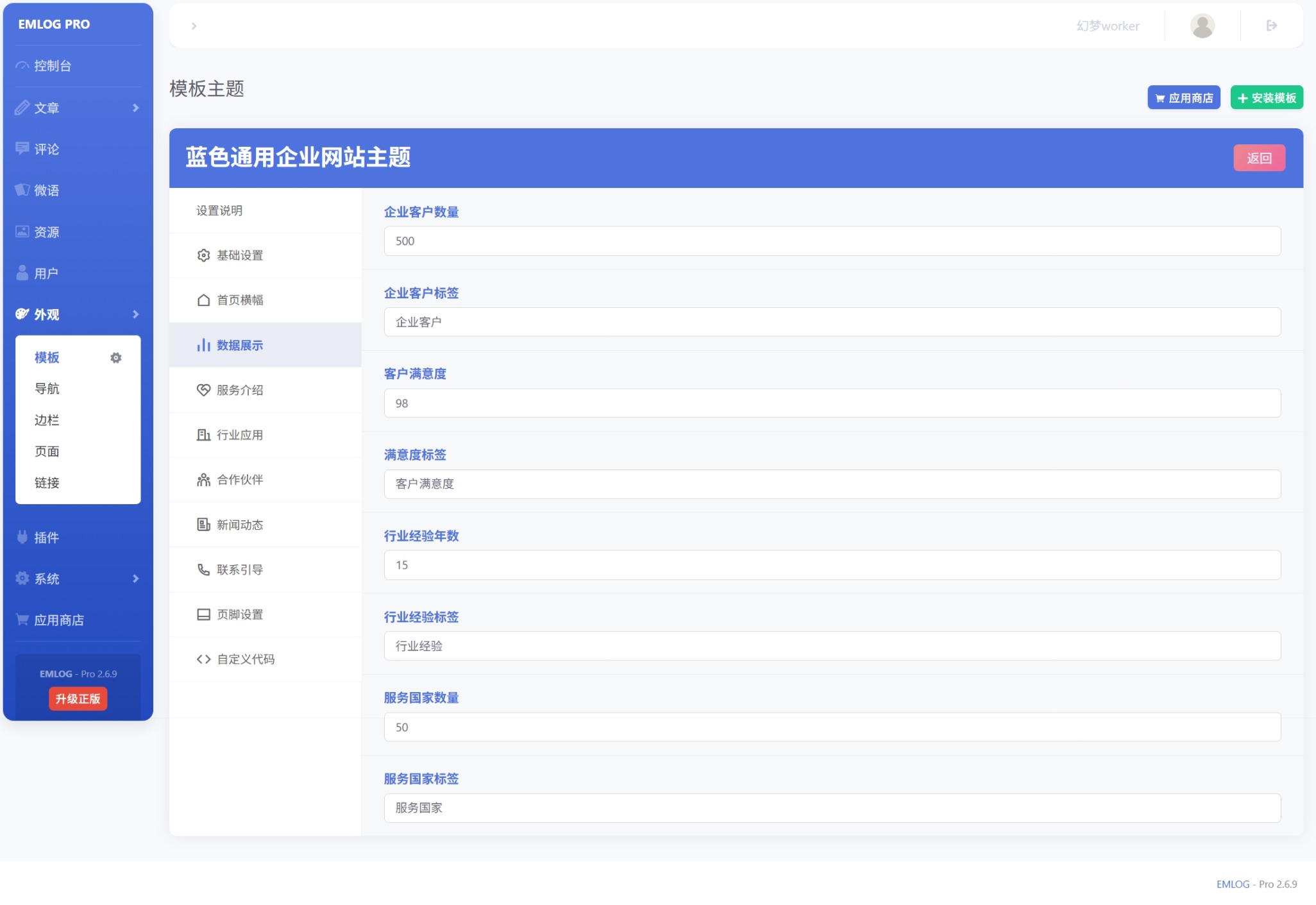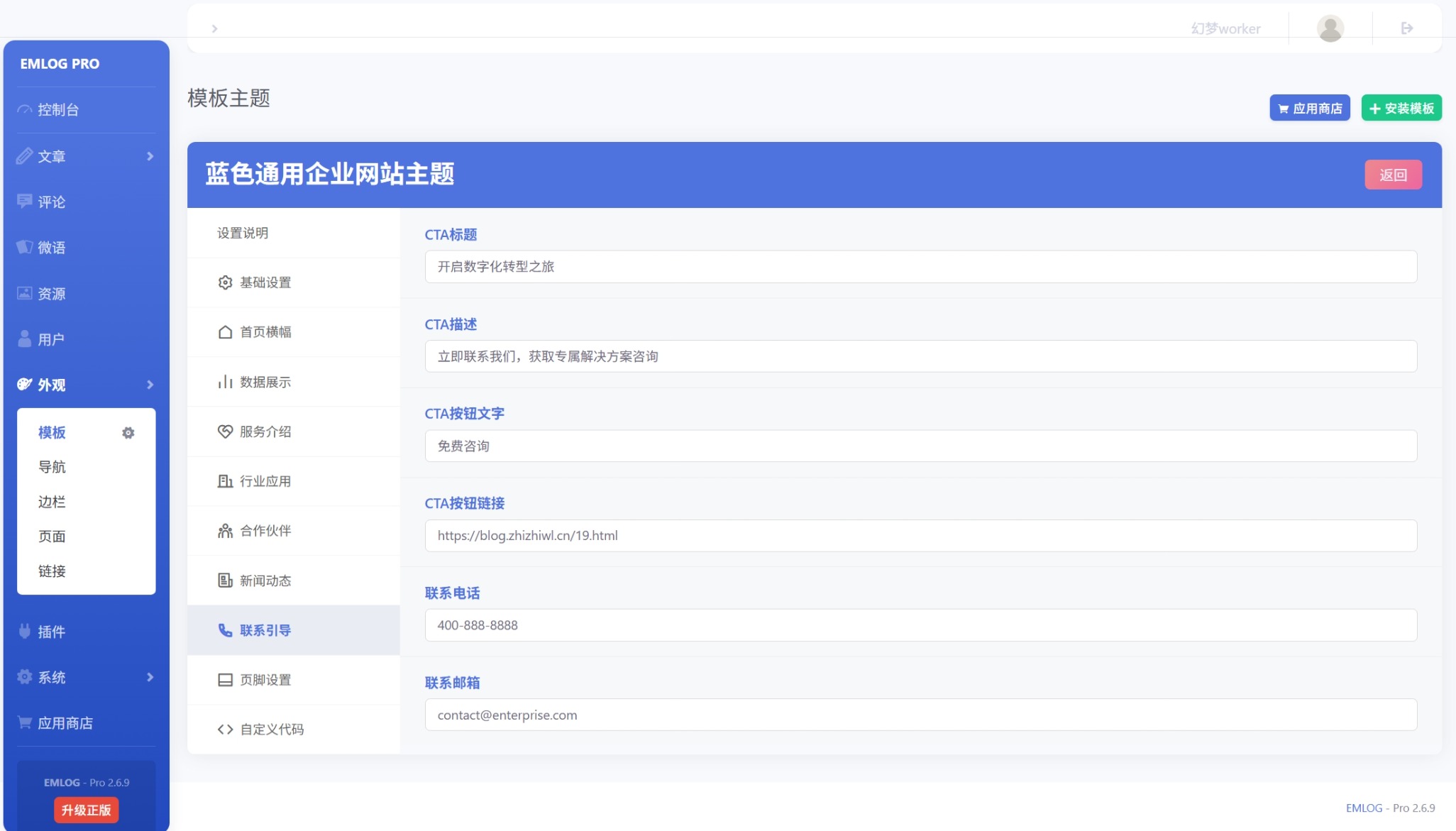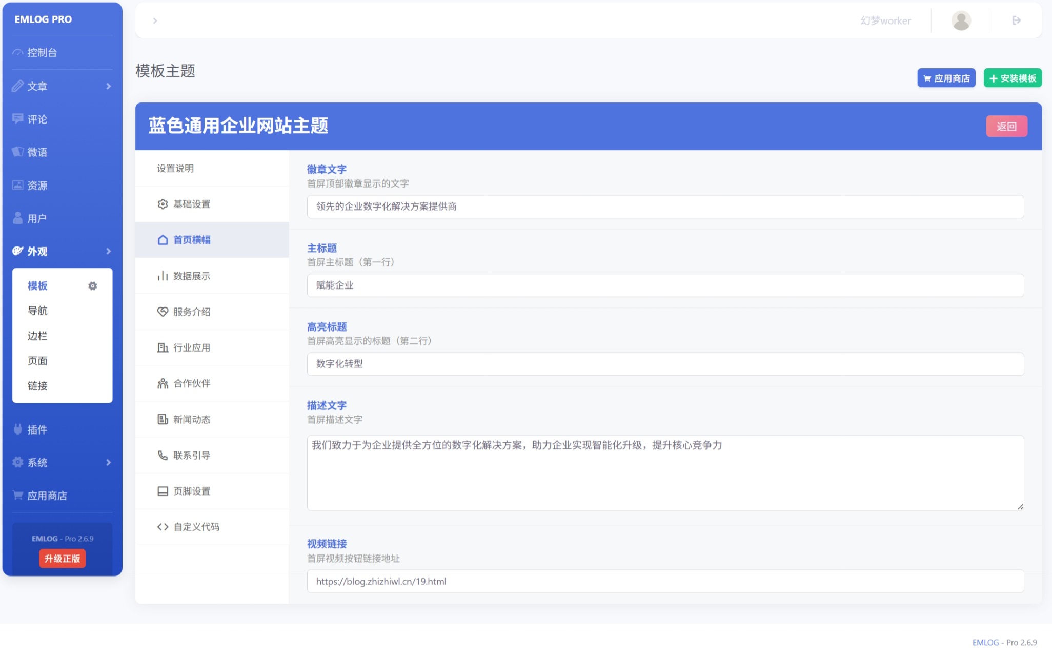 一款专为 Emlog Pro 设计的企业展示主题,采用现代蓝色调设计风格,适合企业官网、公司展示等场景。